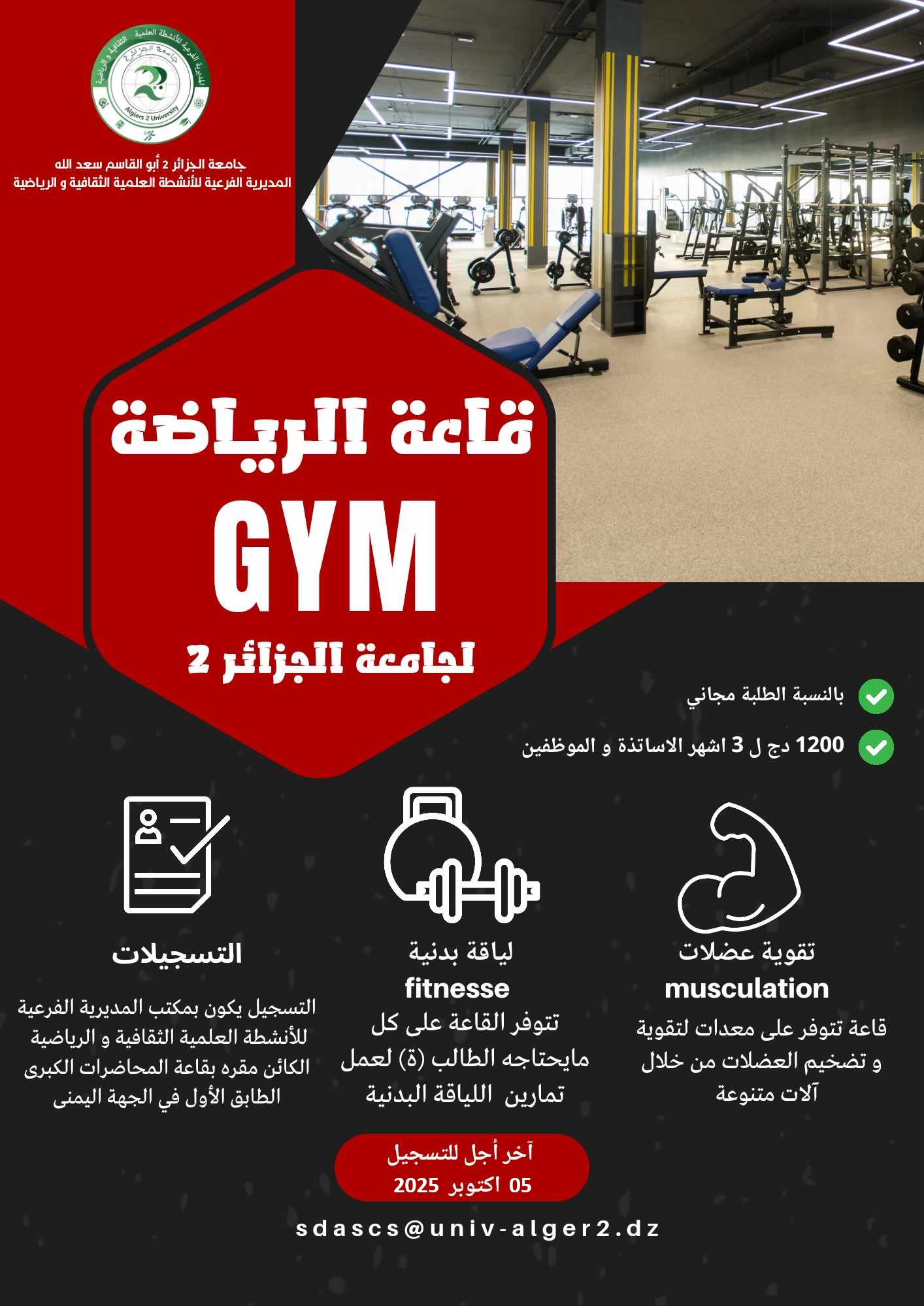 اعلان عن فتح التسجيل في القاعة الرياضية بجامعة الجزائر 2