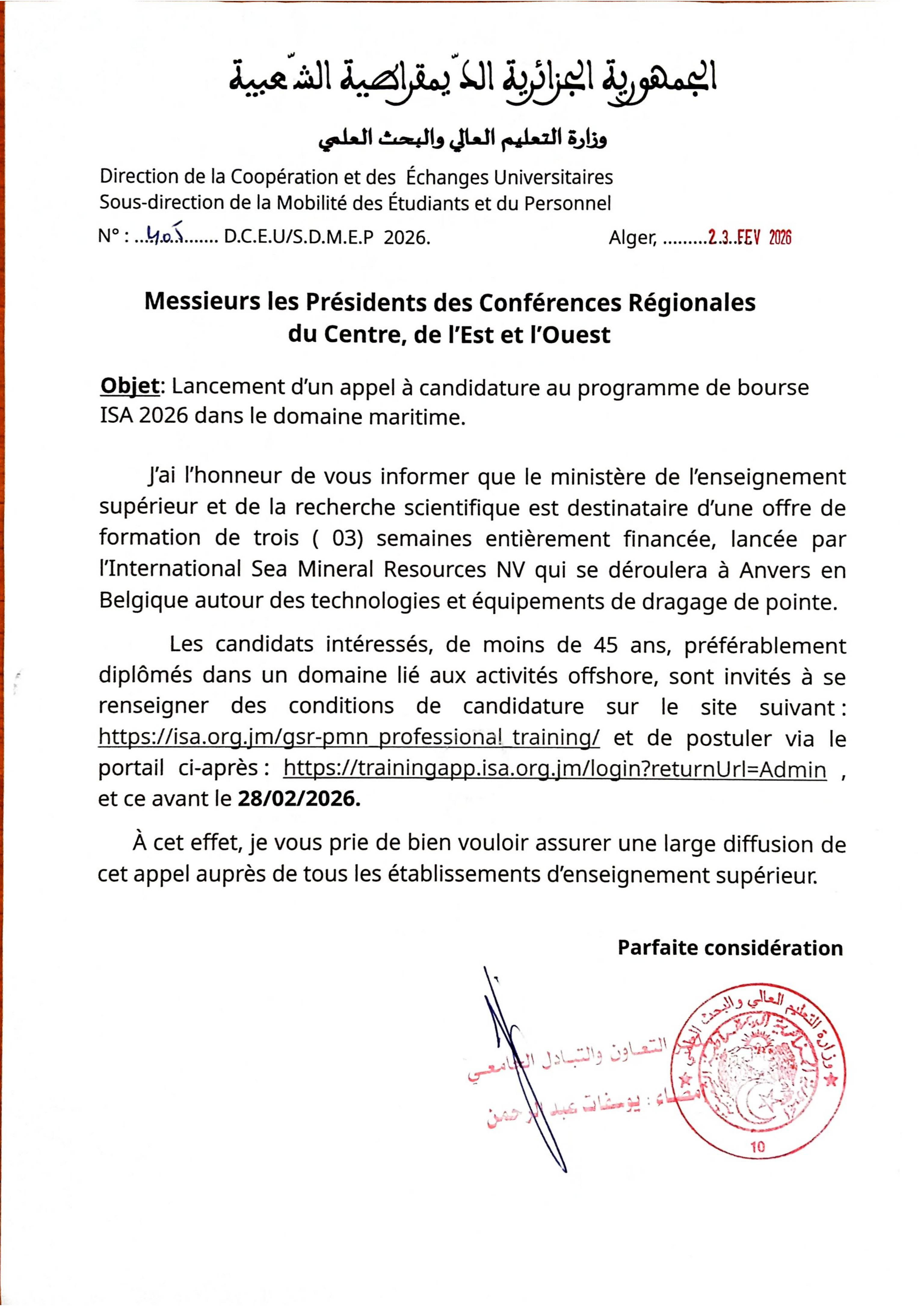 L’Université d'Alger 2 Abou El Kacem Saadallah a l’honneur d’informer que le Ministère de l’Enseignement Supérieur et de la Recherche Scientifique est destinataire d’une offre de formation de 08 à 12 semaines entièrement financée, lancée par l’International Seabed Authority (ISA) en coopération avec l’entreprise Global Sea Mineral Resources NV, qui se déroulera à Anvers en Belgique autour de l’ingénierie maritime.
