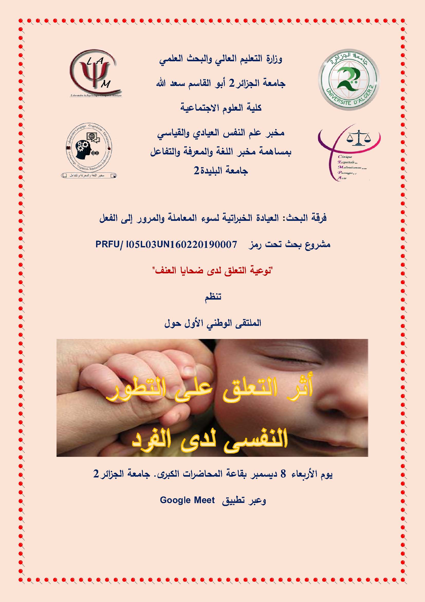 Call for participation to the National Conference on the Impact of the Attachment on the Psychological Development of the individual Written on 14 November 2021. Hits: 1268 تحميل المطوية تحميل ملف الملتقى