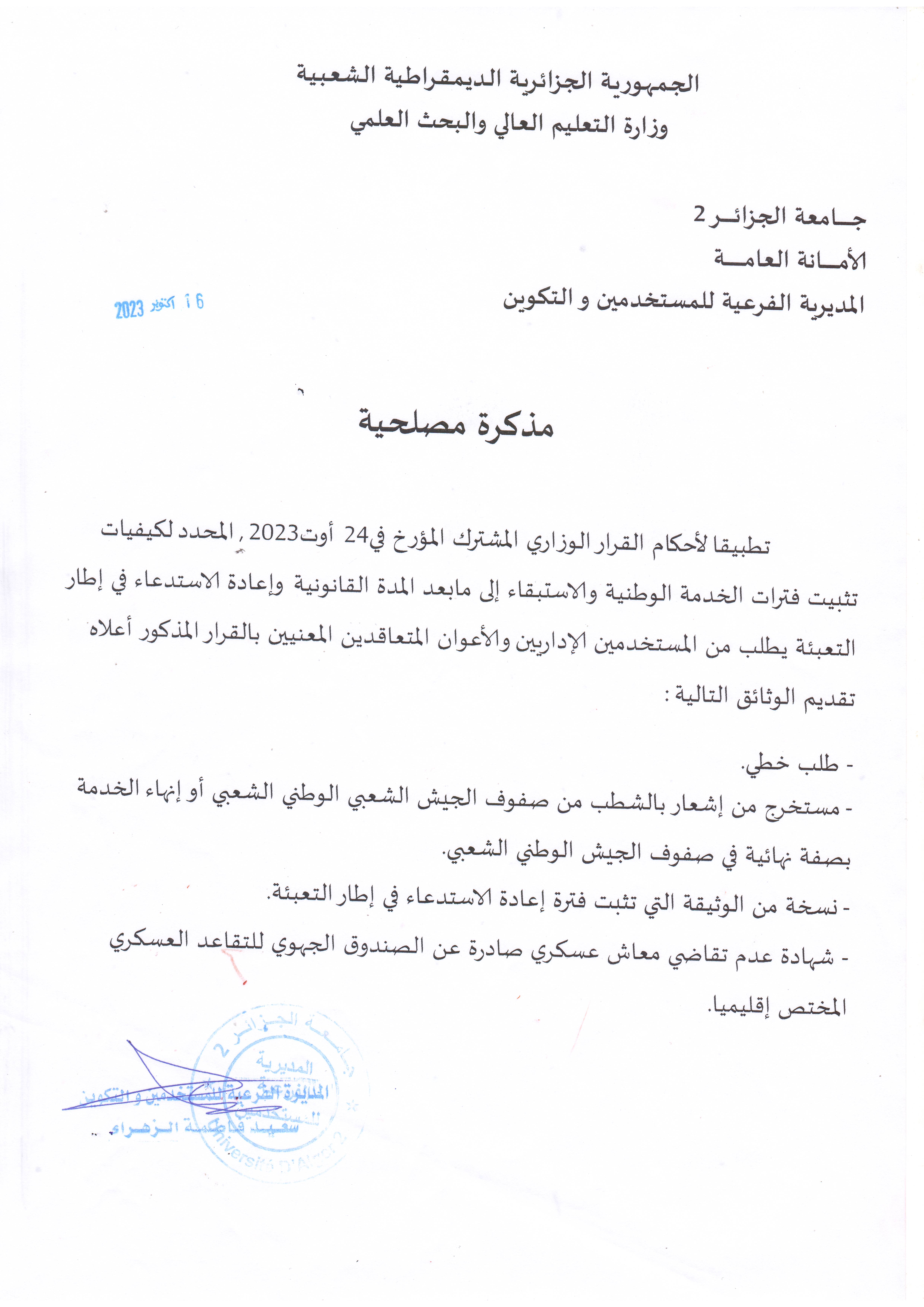 مذكرة مصلحية خاصة بالمديرية الفرعية للمستخدمين و التكوين Publié le 17 octobre 2023. Affichages : 5290