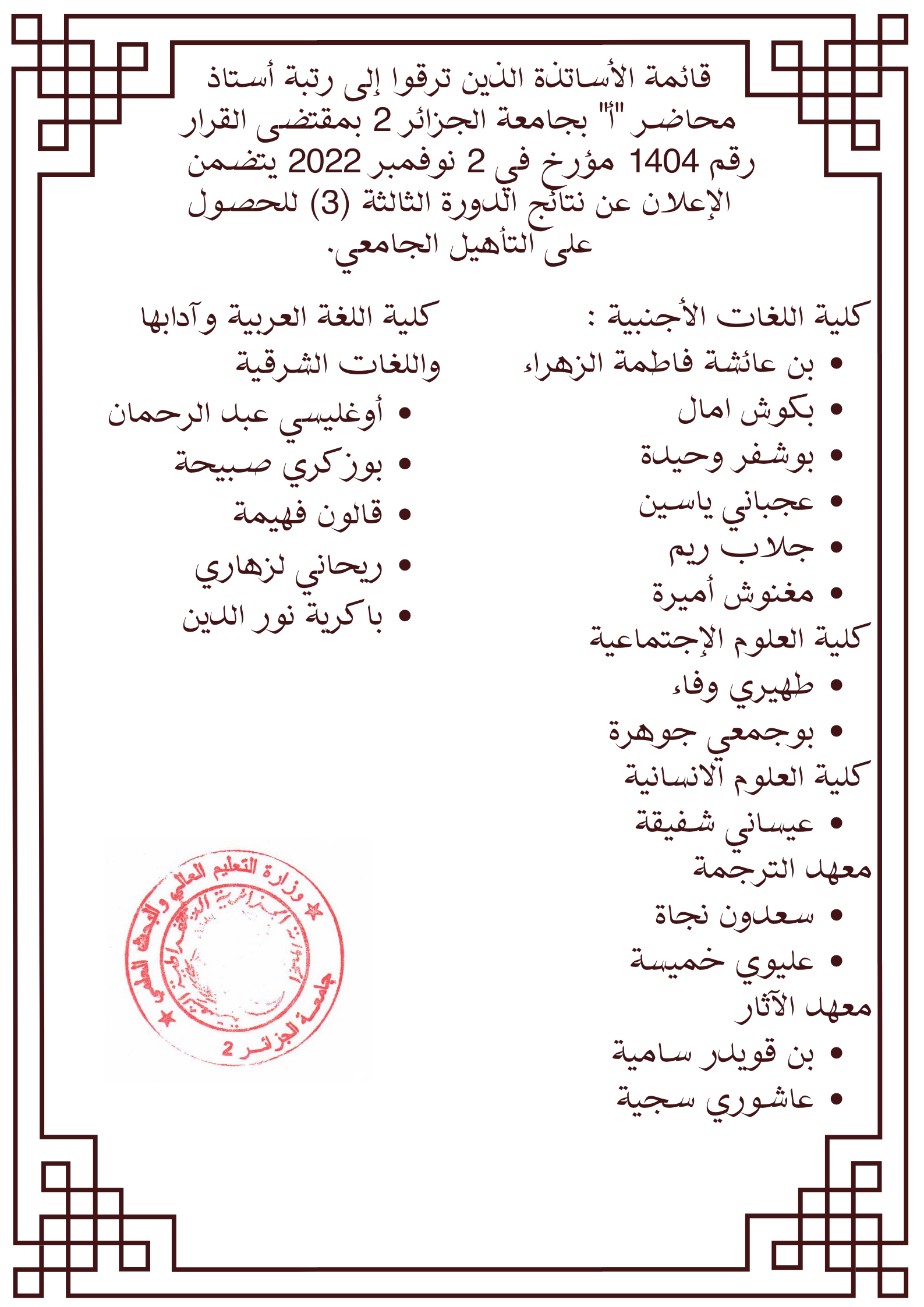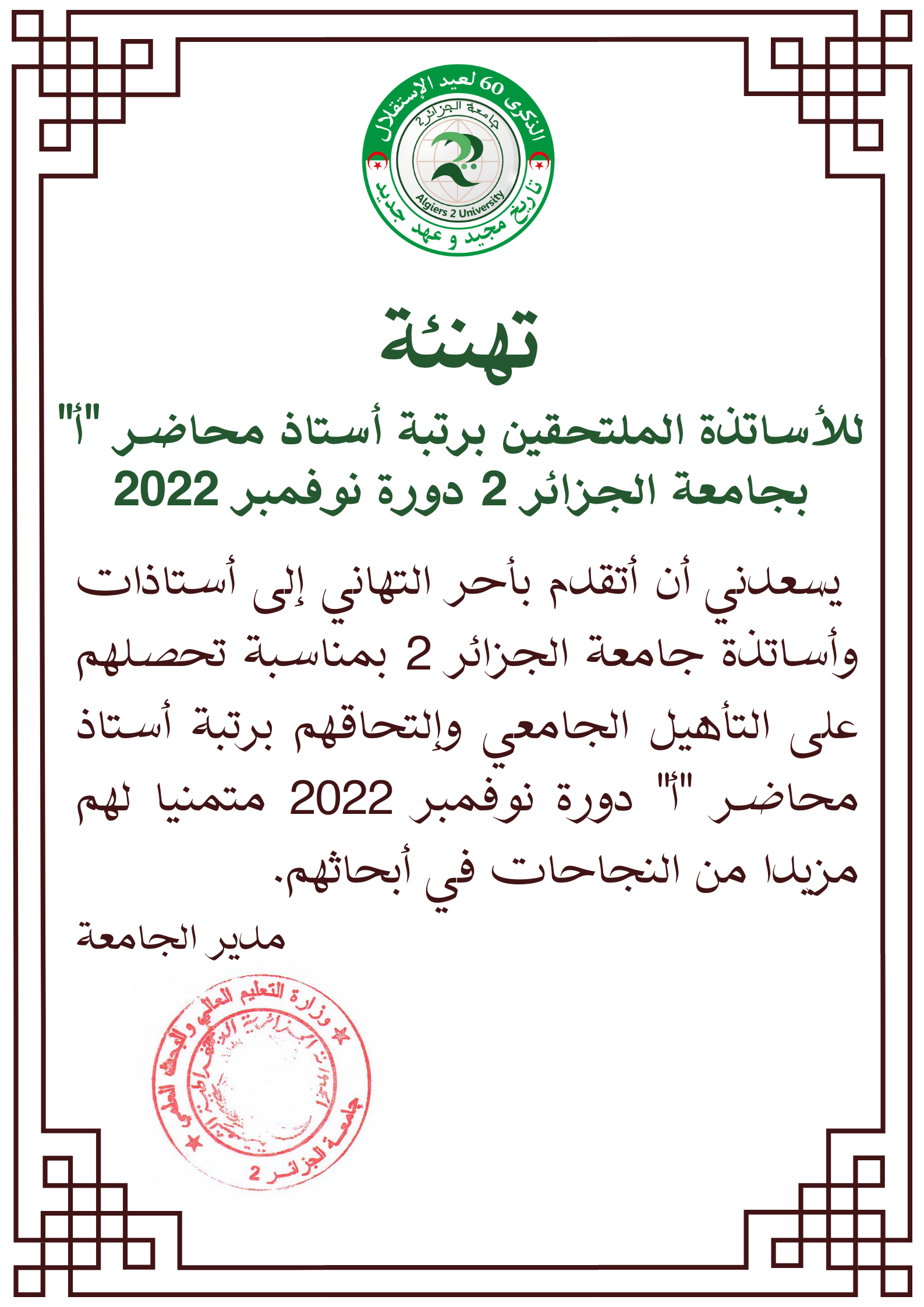 Message de félicitation du Recteur de l’Université aux enseignants promus au grade de « maître-assistant classe A » à l’Université d’Alger 2, session Novembre 2022 Publié le 9 novembre 2022. Affichages : 798 La félicitation du Recteur de l’Université Liste des enseignants promus au grade de « maître-assistant classe A » à l’Université d’Alger 2