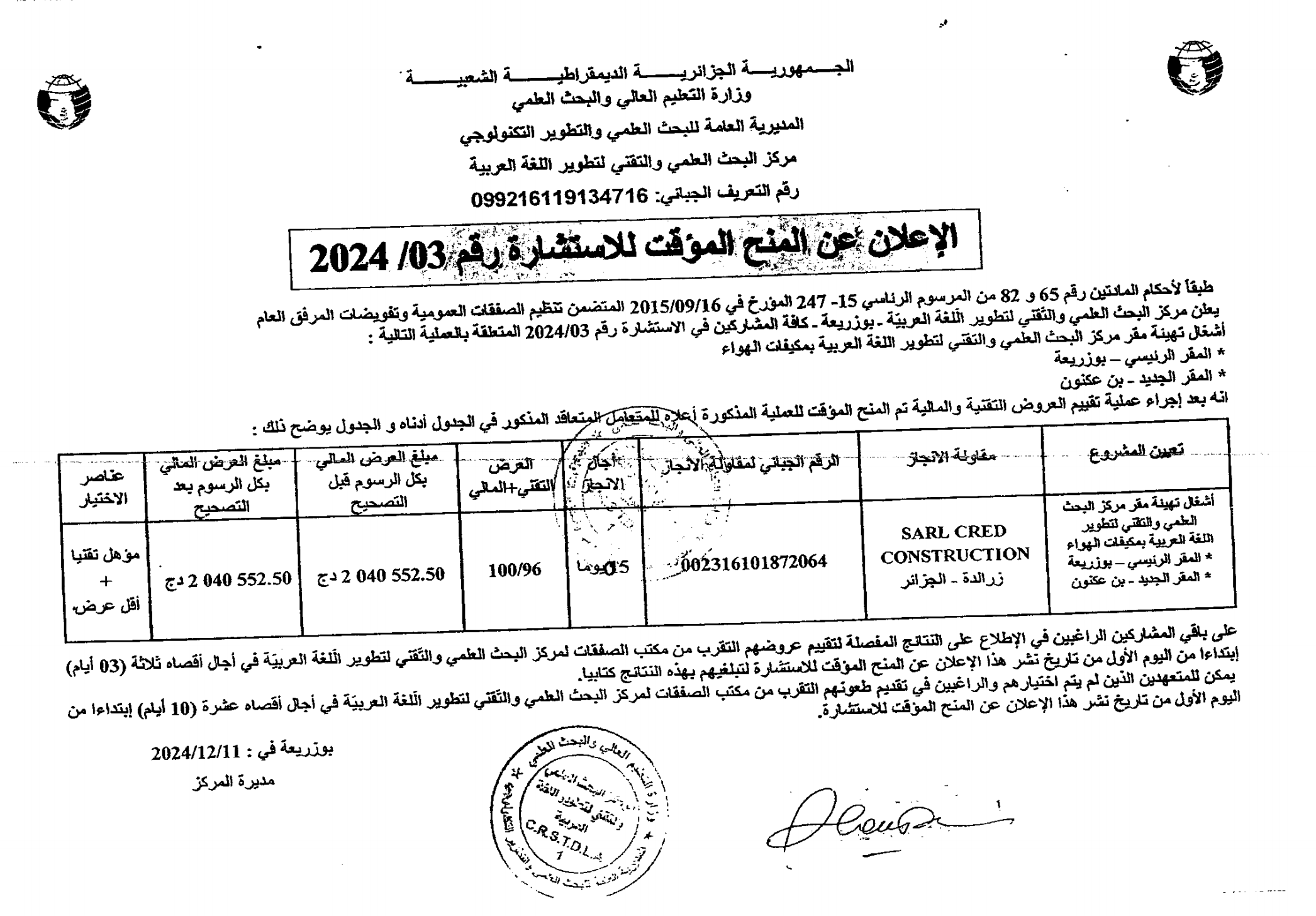 الإعلان عن المنح المؤقت للاستشارة رقم 03/2024 - مركز البحث العلمي لتطوير اللغة العربية Written on 15 ديسمبر 2024. الزيارات: 2065