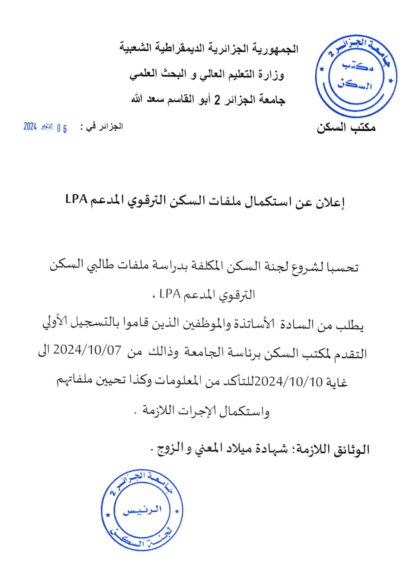 إعلان عن استكمال ملفات السكن الترقوي المدعم LPA