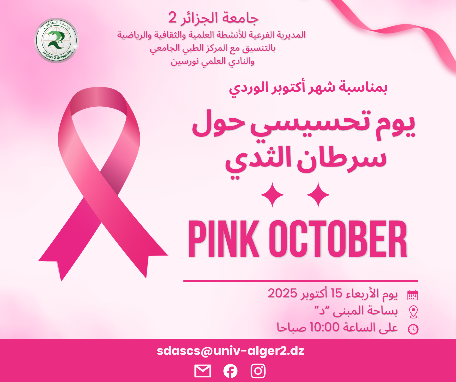 بمناسبة شهر أكتوبر الوردي، تدعوكم جامعة الجزائر 2 لحضور يوم تحسيسي حول سرطان الثدي، بهدف نشر الوعي والتشجيع على الكشف المبكر.