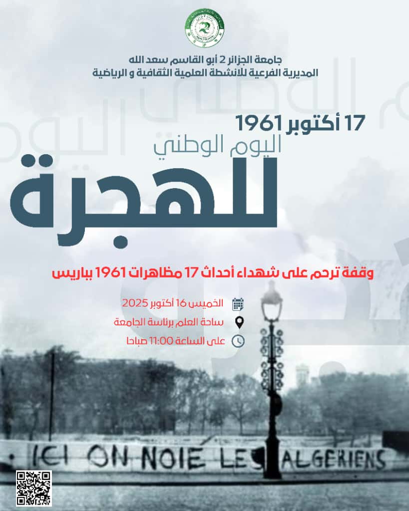 في إطار إحياء ذكرى مجازر 17 أكتوبر 1961، تتشرف جامعة الجزائر 2 بدعوة كافة الأساتذة، الموظفين، والطلبة، لحضور الوقفة الترحمية المقررة
