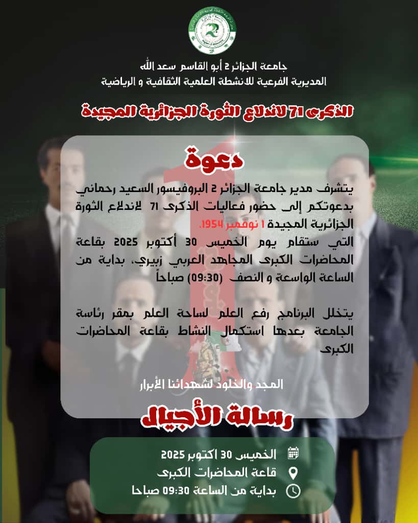 بمناسبة الذكرى الواحدة والسبعين لاندلاع الثورة التحريرية المجيدة، تدعو المديرية الفرعية للأنشطة العلمية والثقافية والرياضية جميع طلبة جامعة الجزائر 2 أبو القاسم سعد الله للمشاركة في المسابقتين التاليتين: