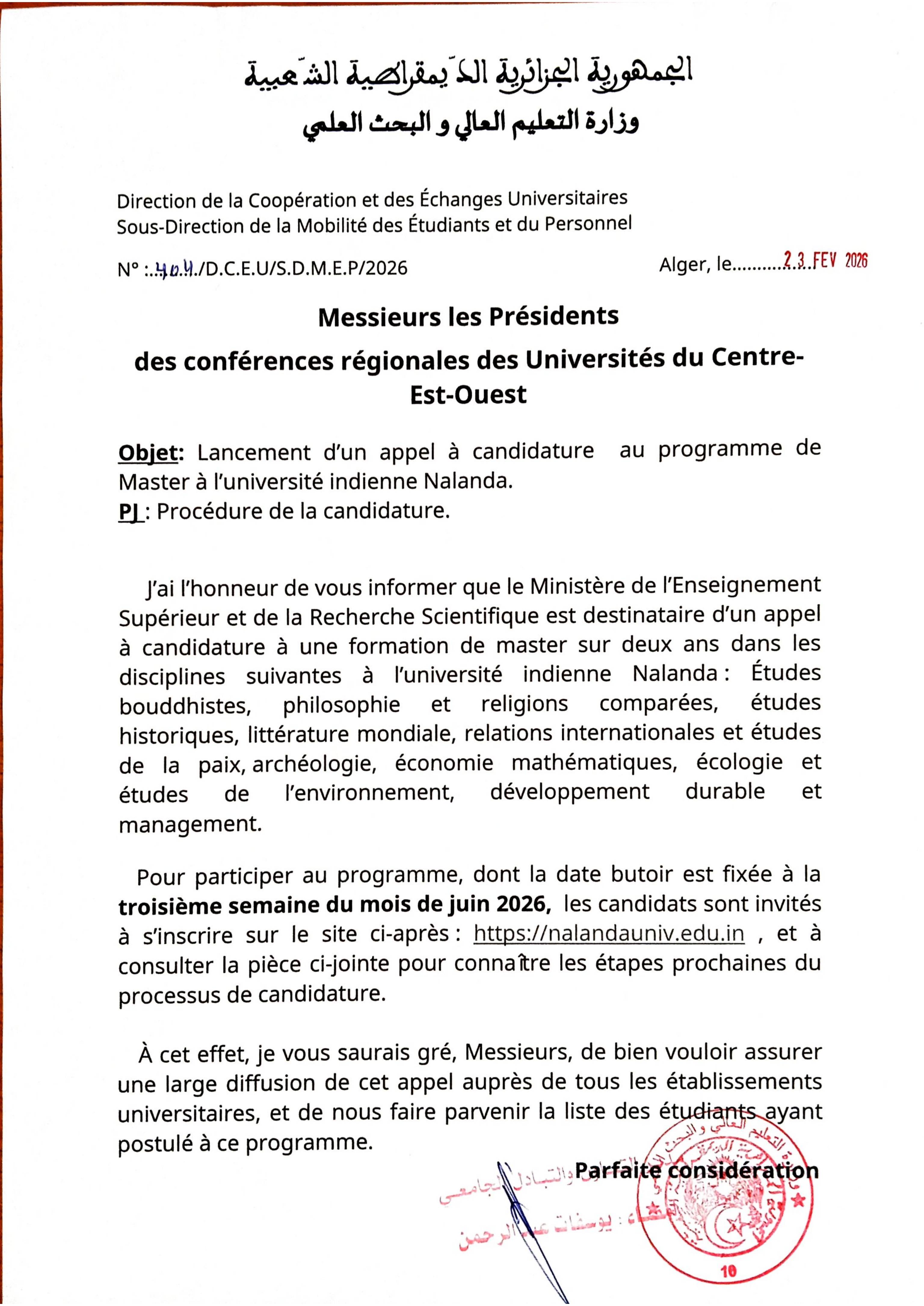 L’Université d'Alger 2 Abou El Kacem Saadallah a l’honneur d’informer l’ensemble des étudiants intéressés qu’un appel à candidature est lancé pour une formation de Master d’une durée de deux (02) ans à l’Université indienne de Nalanda, dans les disciplines suivantes :