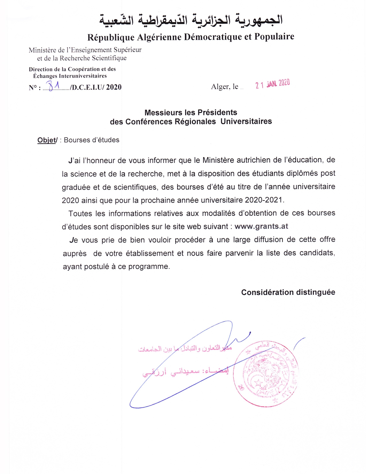عرض منحة دراسية مقدمة من وزارة التعليم والعلوم والبحوث النمساوية Written on 26 جانفي 2020. الزيارات: 2660
