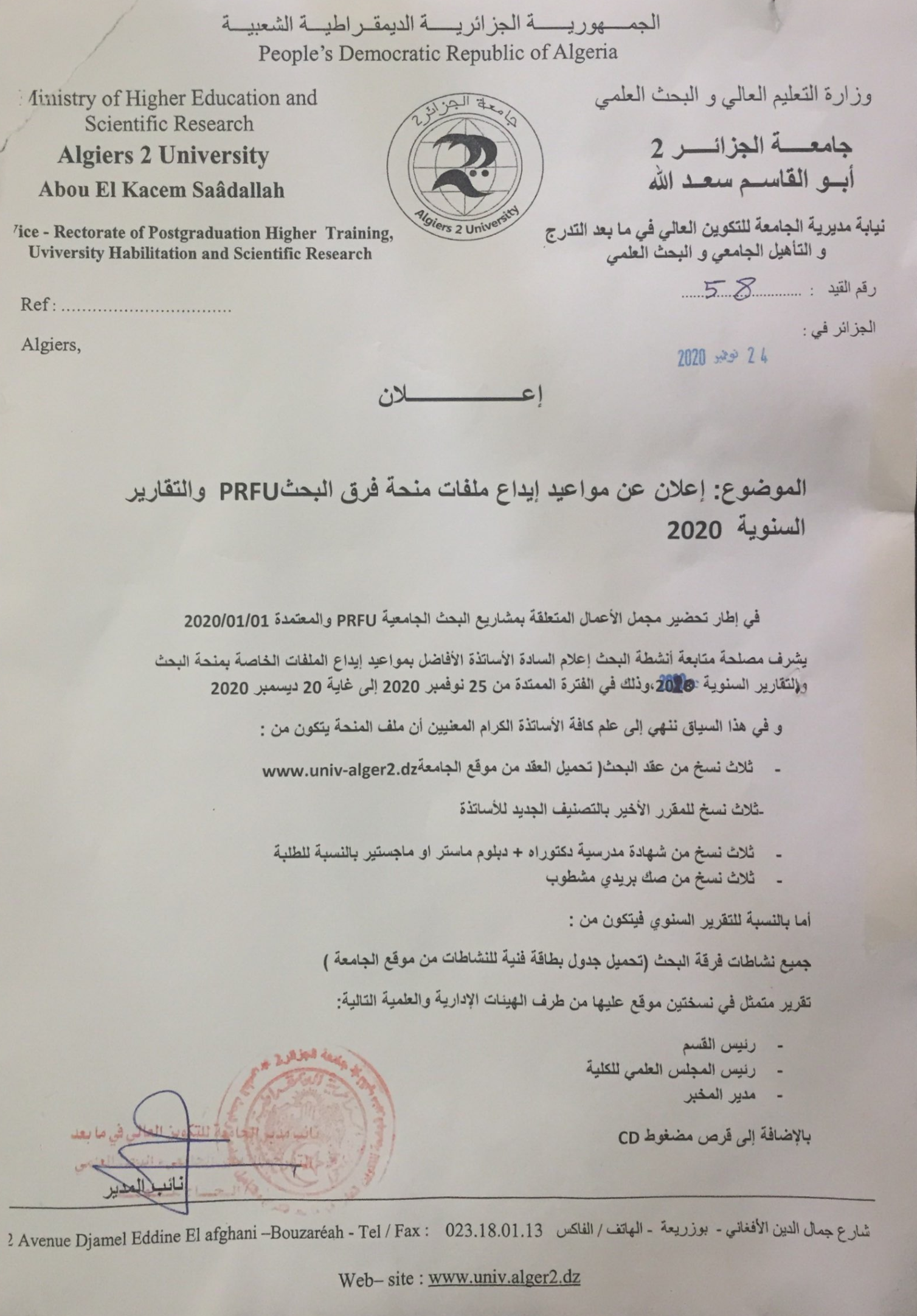PRFU-إعلان عن مواعيد إيداع ملفات منحة فرق البحث والتقارير السنوية 2020 Written on 25 نوفمبر 2020. الزيارات: 5246 عقد القيام بالبحث بطاقة فنية لمشروع البحث التكويني الجامعي