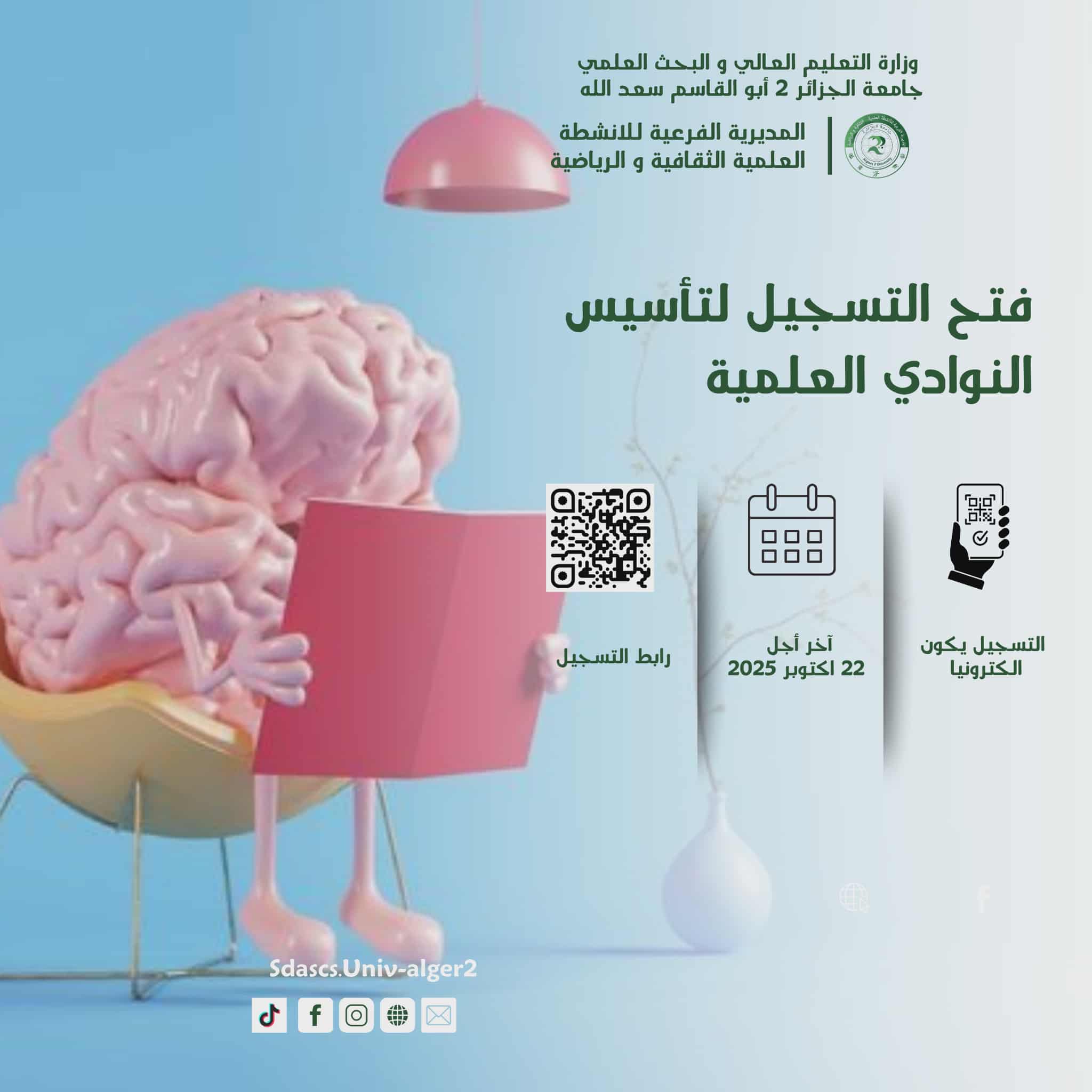 تعلن المديرية الفرعية للأنشطة بجامعة الجزائر 2 عن فتح التسجيل لإنشاء نوادٍ علمية جامعية جديدة، وذلك في إطار تشجيع المبادرات الطلابية ودعم الأفكار الإبداعية.